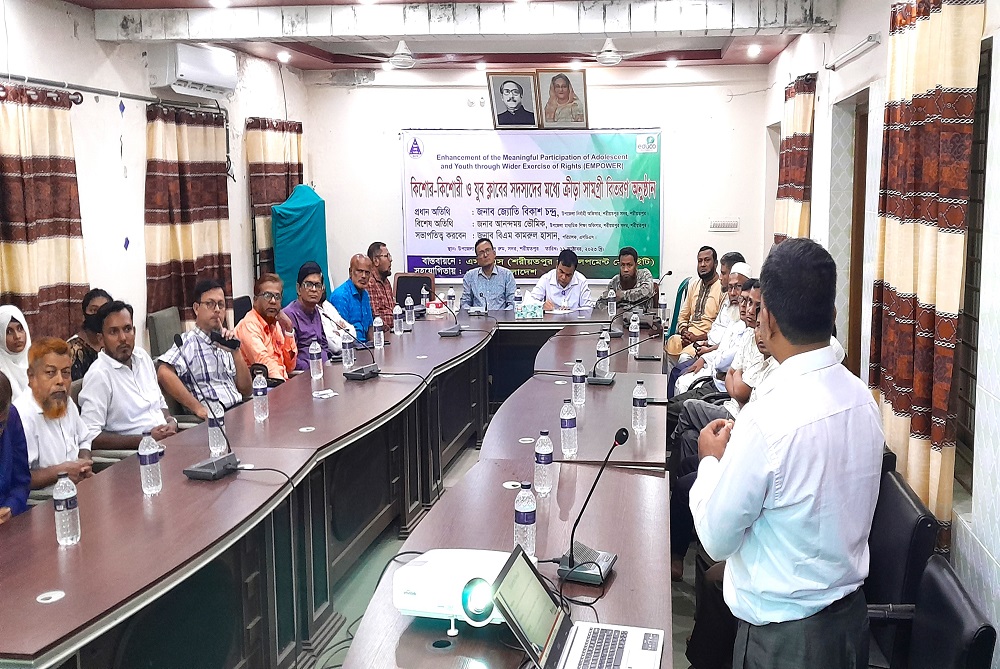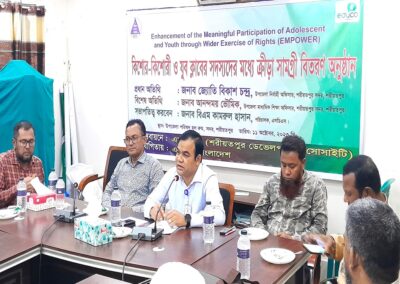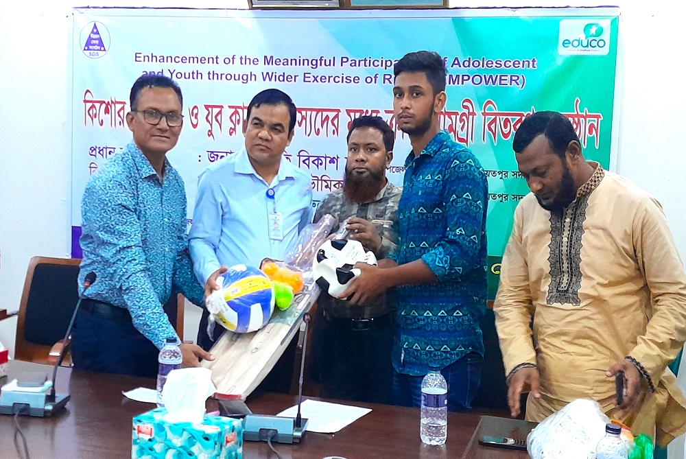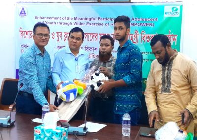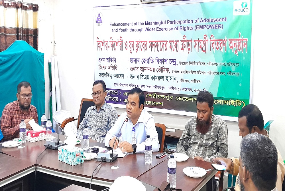 Playing Items Distribution Ceremony was held at UNO Sadar office Hall Room on 11 October 2023 under the project of EMPOWER funded by Educo Bangladesh and implemented by SDS. Mr. Jyoti Bikash Chandra, UNO, Sadar, Shariatpur was present here as chief guest and Mr. Anondamoy Bhowmik, USEO, Sadar, Shariatpur was present here as a special guest. All Headmasters of 20 Secondary School of sadar upazila in Shariatpur and 20 active Members of Adolescent & Youth Club was also present here. They received from UNO a set of playing items (1 football, 1 volleyball, 6 Tennis ball, 1 volleyball net for 19 schools) and (4 badminton, 1 net, 12 feather and 6 tennis ball for Angaria Girls High School). Mr. BM Kamroul Hassan was presided over the program.