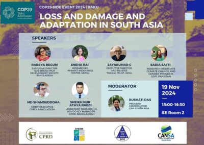 SDS attends this conference as an accredited institution of UNFCCC. Mr. Rabeya Begum (Executive Director, SDS) and Mr. BM Kamrul Hasan (Director, MF, SDS) participated in the conference this year. They organized two side events to highlight the damage caused by the recent floods in Bangladesh and the other to highlight the displacement & migration in Bangladesh due to river erosion and the resulting economic & non-economic losses. During this event, she presented the results of a study on women and adolescents affected by erosion in Naria and Jajira upazilas of Shariatpur district, Bangladesh. CANSA, CPRD and SDS jointly conducted the research in 2020.